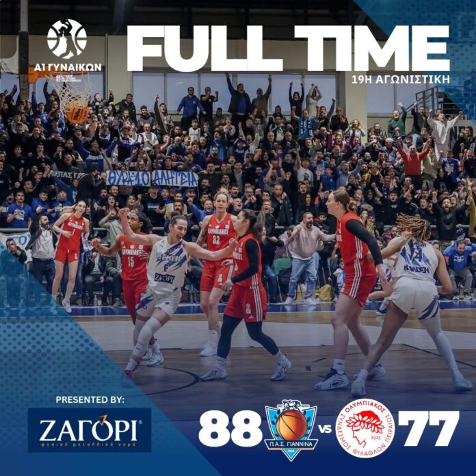 Μία τεράστια νίκη και μία από τις μεγαλύτερες στην ιστορία του συλλόγου, πέτυχε ο ΠΑΣ Γιάννινα, έπειτα από μια συγκλονιστική εμφάνιση, επικρατώντας με 88-77 του Ολυμπιακού για την 19η αγωνιστική του πρωταθλήματος της Α1 Γυναικών.