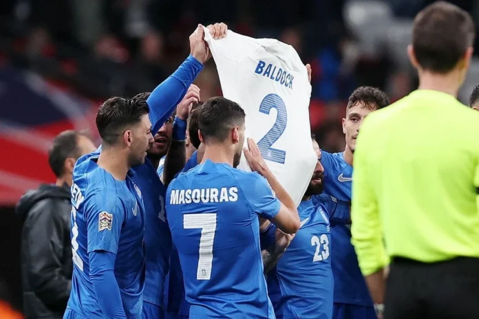 Οι παίκτες της εθνικής αφιέρωσαν το γκολ στον πρώην συμπαίκτη τους, Τζορτζ Μπάλντοκ, υψώνοντας στον ουρανό του Λονδίνου τη φανέλα με το Νο2 που φορούσε το πρώην δεξί μπακ του Παναθηναϊκού.