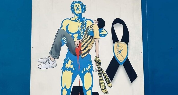 Το ίδιο έπραξε και ο Παναιτωλικός με μία πολύ όμορφη και ιδιαίτερη κίνηση. Στην είσοδο που οδηγεί προς τα αποδυτήρια, οι άνθρωποι της ομάδας του Αγρινίου κρέμασαν ένα συγκλονιστικό πανό στη μνήμη του Άλκη όπου ο Τίτορμος, ο μυθικός ήρωας και έμβλημα του Παναιτωλικού κρατάει στην αγκαλιά του τον Άλκη.