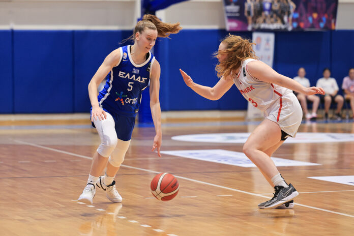 Η Εθνική ξεκίνησε τον αγώνα με τις Σταμολάμπρου, Παυλοπούλου, Σπανού, Λούκα και Χριστινάκη. Οι Δανέζες ξεκίνησαν δυναμικά και πολύ γρήγορα προηγήθηκαν με 8-0 με τα τρίποντα των Γεσπάσεν και Χεζελντέλ. Στα μέσα της περιόδου η Ελλάδα πέρασε για πρώτη φορά μπροστά στο σκορ με 12-10 μετά από εύστοχες βολές της Χριστινάκη.