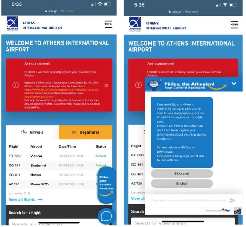 Στο δυναμικό του διεθνούς αερολιμένα Αθηνών και στη διάθεση των ταξιδιωτών για την πληροφόρησή τους, σε θέματα που αφορούν στο ταξίδι σε σχέση με τον COVID-19, πιλοτικά ο νέος “ψηφιακός βοηθός”, «Φίλος» (“Philos”). Έτσι, το αεροδρόμιο της Αθήνας συνεχίζει να διευρύνει και να εμπλουτίζει την ψηφιακή παρουσία του, παρέχοντας ακόμα ένα “ζωντανό” εργαλείο πληροφόρησης στον ταξιδιώτη.