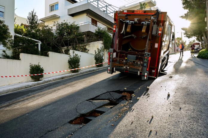 Μια μεγάλη τρύπα άνοιξε στην οδό Ρώμα στον Άλιμο με αποτέλεσμα να βουλιάξει διερχόμενο απορριμματοφόρο και να ακινητοποιηθεί για αρκετή ώρα.