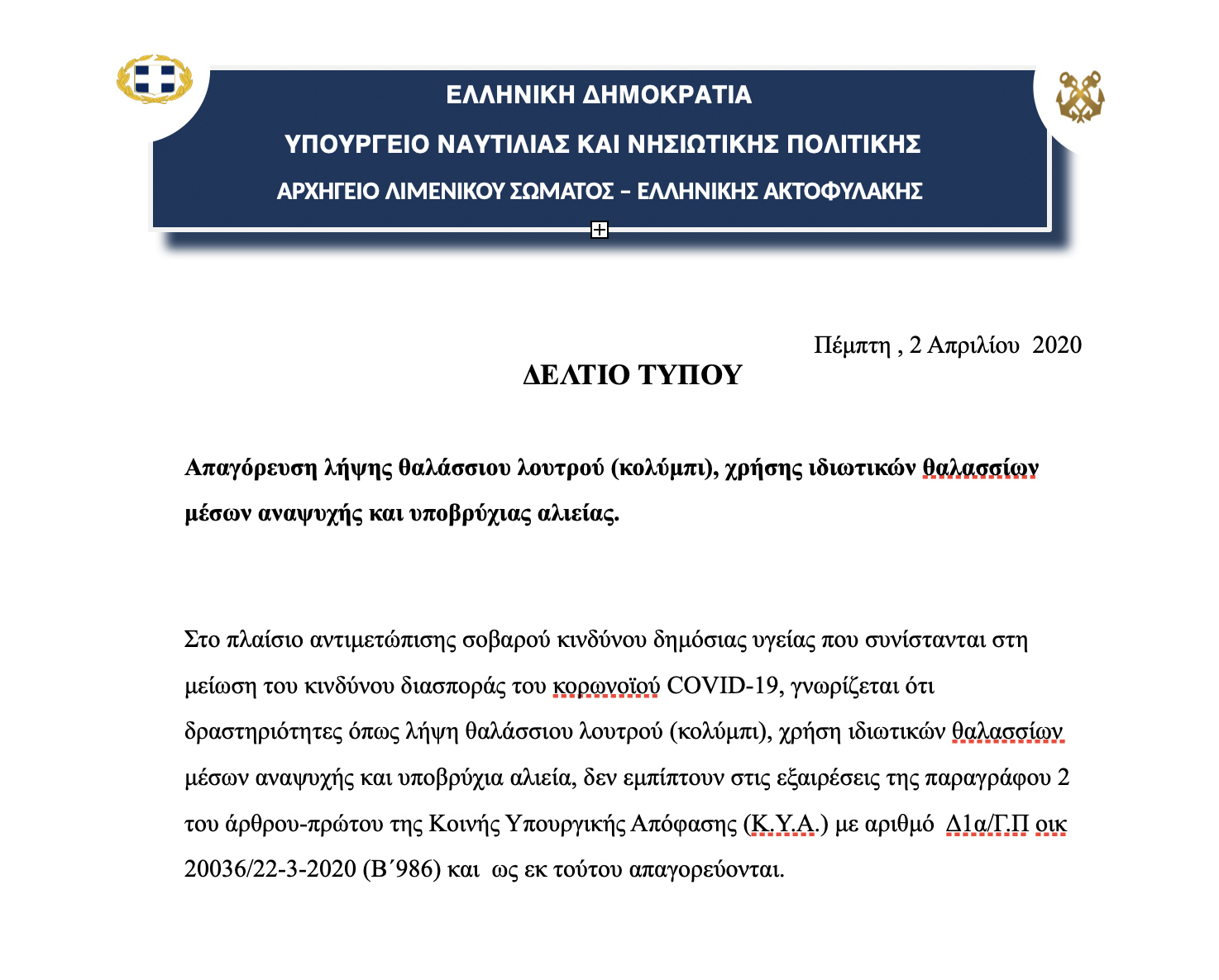 Στο πλαίσιο αντιμετώπισης σοβαρού κινδύνου δημόσιας υγείας που συνίστανται στη μείωση του κινδύνου διασποράς του κορωνοϊού COVID-19, γνωρίζεται ότι δραστηριότητες όπως λήψη θαλάσσιου λουτρού (κολύμπι), χρήση ιδιωτικών θαλασσίων μέσων αναψυχής και υποβρύχια αλιεία, δεν εμπίπτουν στις εξαιρέσεις της παραγράφου 2 του άρθρου-πρώτου της Κοινής Υπουργικής Απόφασης (Κ.Υ.Α.) με αριθμό Δ1α/Γ.Π οικ 20036/22-3-2020 (Β΄986) και ως εκ τούτου απαγορεύονται.
