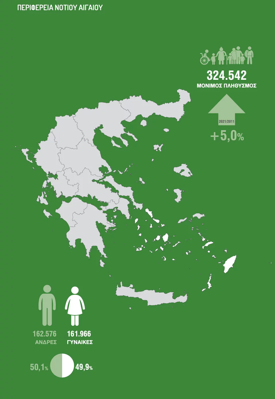 Να σημειωθεί ότι από τις 13 Περιφέρειες της χώρας στις 12 είχαμε πτώση στον πληθυσμό, ενώ σε μία, στο Νότιο Αιγαίο, υπήρχε αύξηση. Συγκεκριμένα, στο Νότιο Αιγαίο, από 309.000 κατοίκους, πλέον καταγράφηκαν 324.000 κάτοικοι.