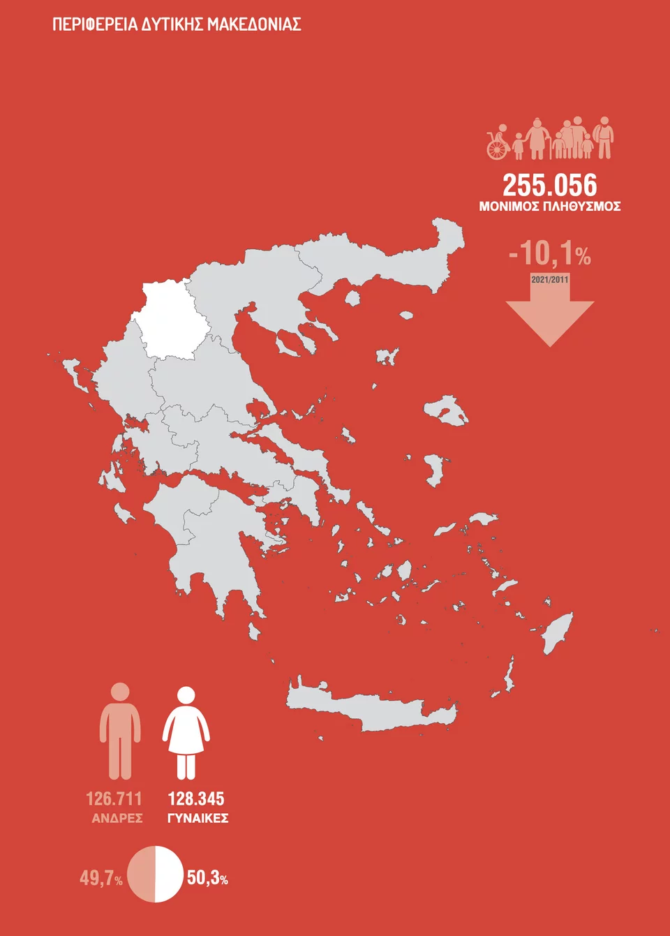 Η μεγάλη μείωση φαίνεται και στο συγκριτικό με τα αποτελέσματα του 2011 όταν η Δυτική Μακεδονία είχε 283.689 μόνιμους κατοίκους με 141.779 άνδρες και 126.711 (γυναίκες).