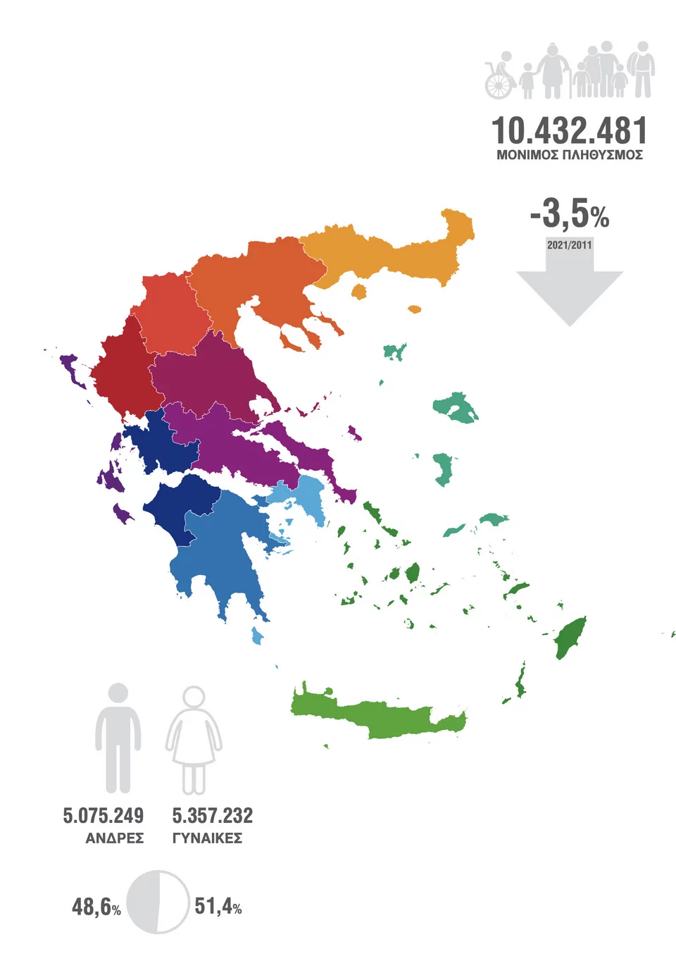 Το 2011 είχε υπολογιστεί σε 10.815.197 και σήμερα στην Απογραφή 2021 είναι 10.432.481, μία μείωση της τάξης του 3,5%.
