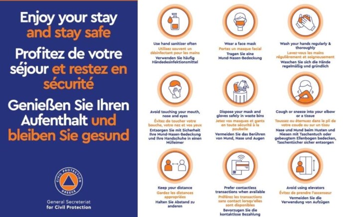 Με κεντρικό μήνυμα «Απολαύστε τη διαμονή σας – Μείνετε ασφαλείς» (Enjoy your stay and stay safe), η Γενική Γραμματεία Πολιτικής Προστασίας (ΓΓΠΠ) προχώρησε στην έκδοση εννέα οδηγιών για τη λήψη των απαραίτητων μέτρων προστασίας από τον κορωνοϊό, με δεδομένο ότι από την 1η Ιουλίου «ανοίγουν» 41 πύλες εισόδου στην Ελλάδα και ειδικότερα 27 αεροδρόμια, 7 χερσαία σημεία εισόδου και 7 λιμάνια.