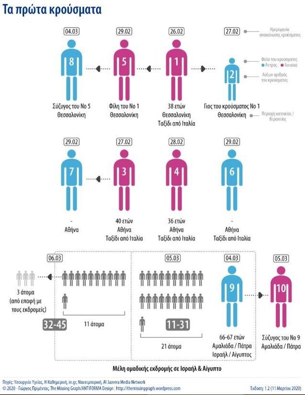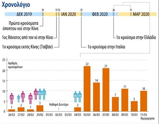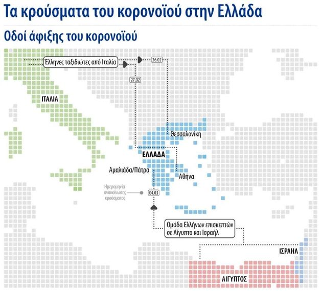 Ακολουθεί ο χάρτης των εγχώριων κρουσμάτων και της προέλευσής τους μέχρι σήμερα, καθώς και γραφήματα με το χρονολόγιο εξάπλωσης του ιού στην ελληνική επικράτεια, όπως σχεδιάστηκαν από τον σχεδιαστή γραφικών, Γιώργο Πριμέντα, της Antiforma Design.