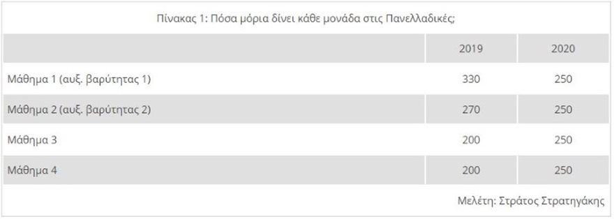 Σύμφωνα με τον κ. Στρατηγάκη, σε άρθρο του στη «Ναυτεμπορική». πλέον «δεν υπάρχουν μαθήματα που δίνουν περισσότερα μόρια, όπως υπήρχαν μέχρι και το 2019 τα μαθήματα αυξημένης βαρύτητας. Έτσι κάθε μάθημα δίνει τώρα 250 μόρια σε αντίθεση με το 2019, όπως μπορείτε να δείτε στον παρακάτω πίνακα.»
