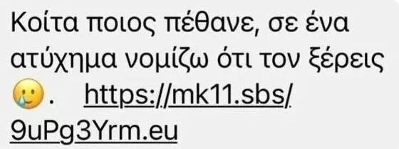 Το μήνυμα αναφέρει «Κοίτα ποιος πέθανε σε ένα ατύχημα, νομίζω ότι τον ξέρεις» και συνοδεύεται από ένα θλιμμένο emoji.