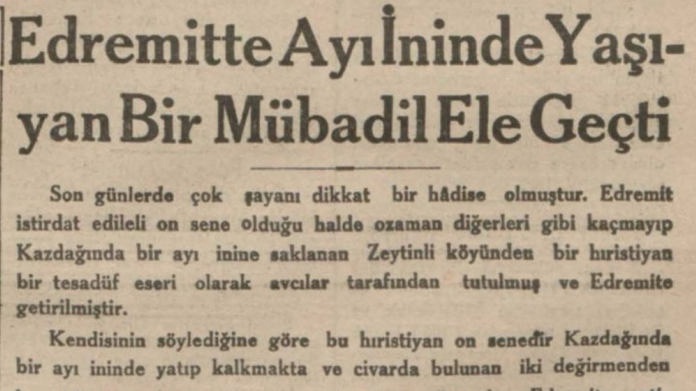 Τίτλος του άρθρου «Συνελήφθη ένας από τους ανταλλάξιμους (σ.σ. βάσει της Συνθήκης της Λωζάννης της οποίας η υπογραφή έγινε σαν σήμερα 30 Ιανουαρίου του 1923) ο οποίος ζούσε σε μια φωλιά αρκούδας στο Αδραμμύτι», πόλη της Τουρκίας, που βρίσκεται στο βορειοδυτικό τμήμα της Μικράς Ασίας. Και γράφει το 90χρονο ρεπορτάζ: «Πριν λίγες μέρες συνέβη ένα πολύ αξιοπρόσεκτο γεγονός. Παρότι έχουν περάσει ήδη δέκα χρόνια από την ανακατάληψη του Αδραμμυτίου, κυνηγοί ανακάλυψαν τυχαία ένα Χριστιανό από το χωριό Ζεϊτινλί, ο οποίος εκείνη την εποχή δεν διέφυγε όπως οι άλλοι, αλλά κρύφτηκε σε φωλιά αρκούδας στο όρος Κάζνταγ. (σ.σ η αρχαία Ίδη). Το συνέλαβαν και τον μετέφεραν στο Αδραμμύτι (Edremit).