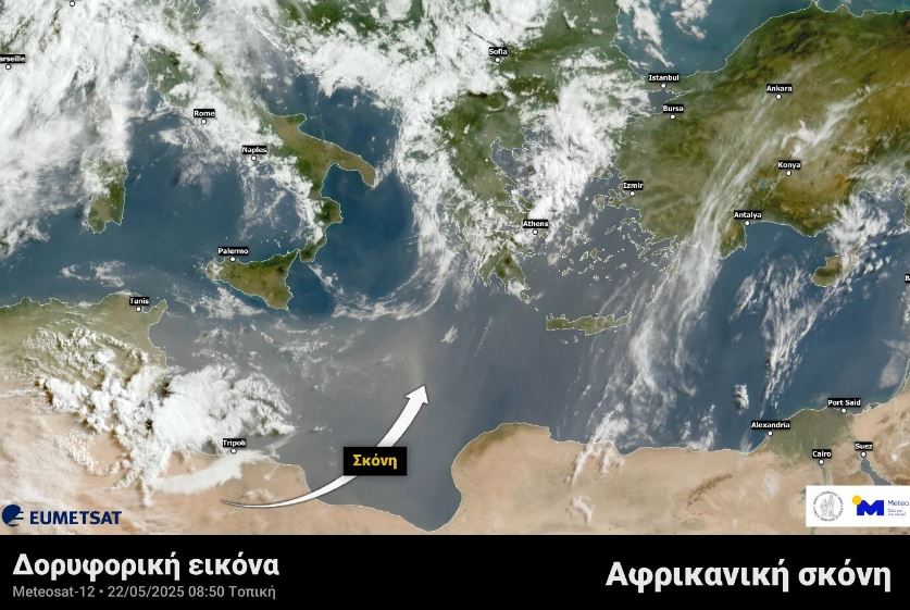 Το επεισόδιο μεταφοράς αφρικανικής σκόνης αναμένεται να διαρκέσει μέχρι και την Κυριακή 25/5 επηρεάζοντας αρχικά την ηπειρωτική χώρα και την Κρήτη και σταδιακά και τις υπόλοιπες περιοχές.