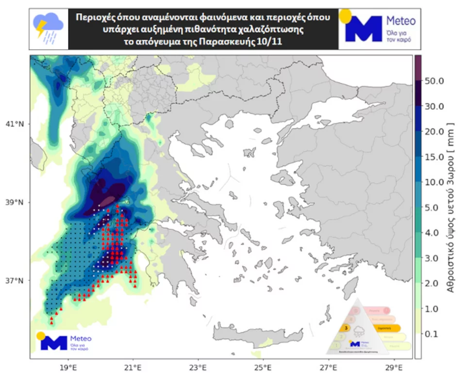 Στους χάρτες που ακολουθούν παρουσιάζεται ο υετός που αναμένεται το απόγευμα και τις πρώτες βραδινές ώρες της Παρασκευής 10/11 καθώς και οι περιοχές με αυξημένη πιθανότητα χαλαζόπτωσης. Με μαύρες και λευκές κουκίδες σημειώνονται οι περιοχές με αυξημένη πιθανότητα χαλαζόπτωσης με χαλάζι μικρού μεγέθους ενώ με κόκκινα τρίγωνα σημειώνονται οι περιοχές με αυξημένη πιθανότητα χαλαζόπτωσης με χαλάζι μεγαλύτερου μεγέθους.