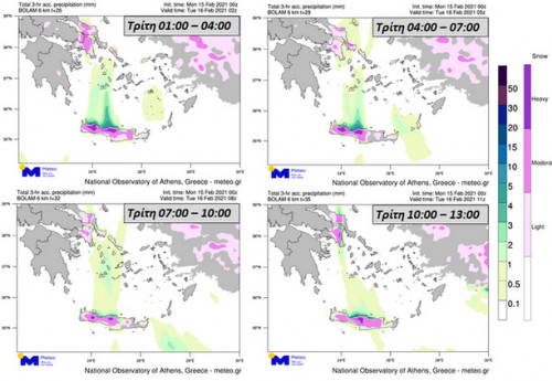Αύριο Τρίτη (16-02-2021) οι πυκνές χιονοπτώσεις θα συνεχιστούν στην ανατολική Στερεά, την Εύβοια, στα νησιά του βορείου και ανατολικού Αιγαίου, στα ορεινά και ημιορεινά των Κυκλάδων, καθώς και σε περιοχές της Κρήτης με χαμηλότερο υψόμετρο. Από αργά το βράδυ στην ανατολική Στερεά και την Εύβοια τα φαινόμενα θα εξασθενήσουν.