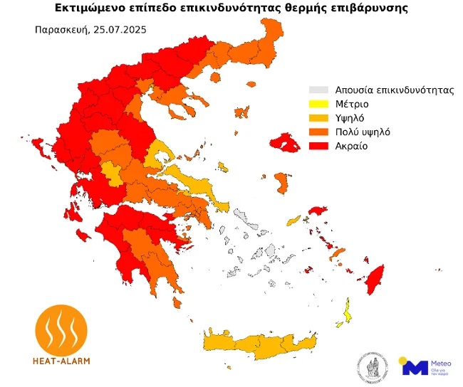 Από την Εθνική Μετεωρολογική Υπηρεσία εκδόθηκε σήμερα Έκτακτο Δελτίο Επικίνδυνων Καιρικών Φαινομένων – Κόκκινη Προειδοποίηση για πολύ υψηλά επίπεδα θερμοκρασίας μέχρι και την Κυριακή 27 Ιουλίου.