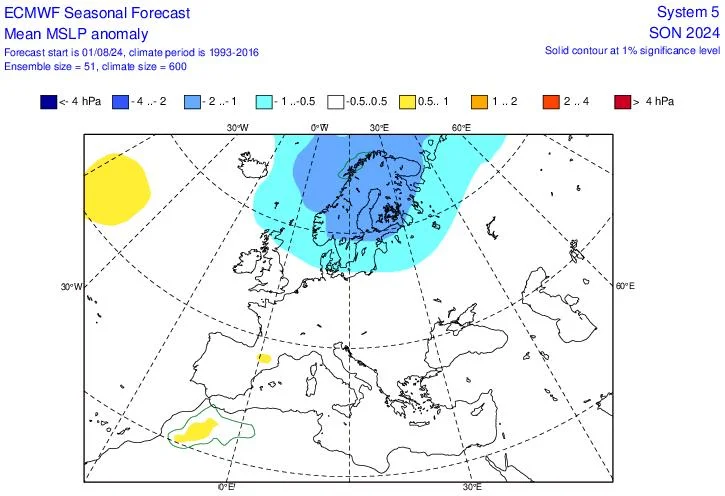 Προγνωστικοί χάρτες του ECMWF και του multi-modelsystem με τις αποκλίσεις της ατμοσφαιρικής (βαρομετρικής) πίεσης στην επιφάνεια (MSLP) για το Φθινόπωρο 2024 (3-month average), με αρχικές τιμές της 01/08/2024