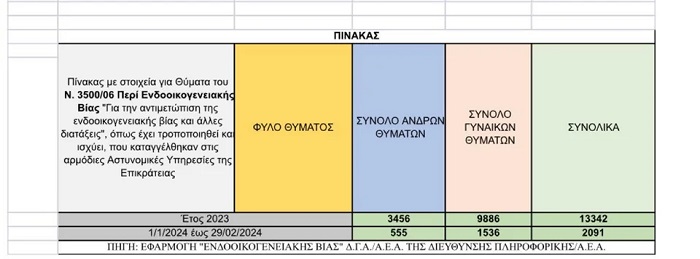 Μέσα σε δύο μόλις μήνες του 2024, από την 1η Ιανουαρίου ως και την τελευταία ημέρα του Φεβρουαρίου φέτος, έχουν γίνει συνολικά 2.091 καταγγελίες. Εξ αυτών το ένα τρίτο (555) αφορούσε θύματα άνδρες ενώ 1.536 είχε θύματα γυναίκες.