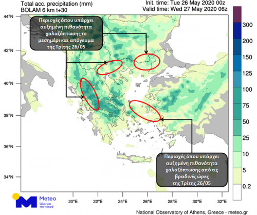 Στο χάρτη που ακολουθεί παρουσιάζεται ο ολικός υετός που αναμένεται έως τις πρωινές ώρες της Τετάρτης 27/05 καθώς και οι περιοχές όπου η πιθανότητα εκδήλωσης χαλαζοπτώσεων είναι αυξημένη.