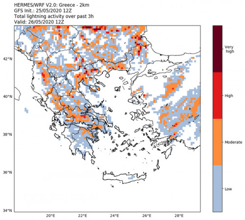 Στο χάρτη που ακολουθεί παρουσιάζεται ενδεικτικά η αναμενόμενη ισχύς της το μεσημέρι της Τρίτης 26/05.