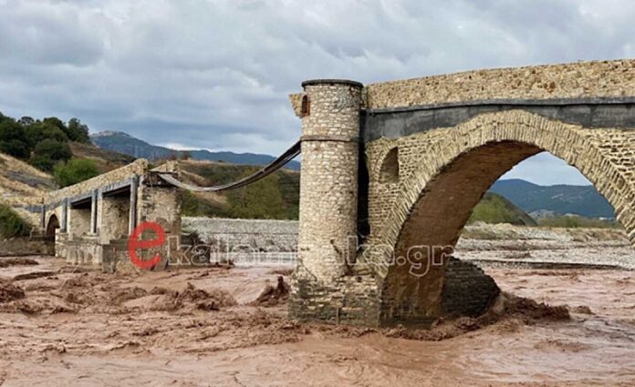 Το ιστορικό γεφύρι της Σαρακίνας στην Καλαμπάκα, δεν άντεξε τον μεγάλο όγκο νερού από την κακοκαιρία Daniel