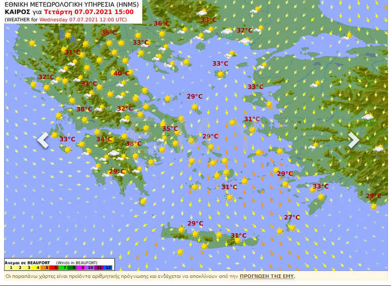 Γενικά αίθριος ο καιρός. Τις μεσημβρινές και απογευματινές ώρες στα ηπειρωτικά θα αναπτυχθούν πρόσκαιρες τοπικές νεφώσεις. Οι άνεμοι από βόρειες διευθύνσεις 3 με 4 και βαθμιαία στα ανατολικά τοπικά 5 μποφόρ. Η θερμοκρασία από 22 έως 38 και κατά τόπους 39 βαθμούς Κελσίου. Στα παραθαλάσσια η μέγιστη 2 με 3 βαθμούς χαμηλότερη.