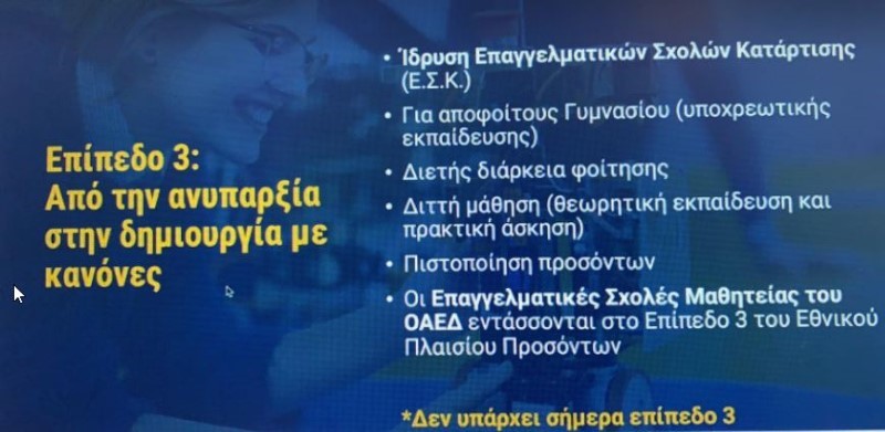 Το επίπεδο 3 θα αφορά τους αποφοίτους της υποχρεωτικής εκπαίδευσης (Γυμνασίου), θα είναι διετούς διάρκειας και θα εστιάζει σε επαγγέλματα τεχνιτών, ενώ σαν βαθμίδα θα είναι ένα «κλικ» πίσω από τα ΕΠΑΛ. Σε ερώτηση για τα επαγγελματικά πεδία που «ανοίγουν», το υπουργείο Παιδείας επισήμανε ότι ήδη υπάρχουν αιτήματα για «καλοπληρωμένες θέσεις» εξειδικευμένων τεχνιτών στη ναυπηγοεπισκευαστική ζώνη, για τεχνίτες μαρμάρου και ειδικότητες τοπικού χαρακτήρα, όπως οι καραβομαραγκοί.
