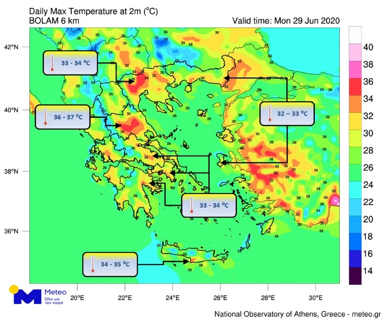 Θερμοκρασία: Από 17 έως 37 βαθμούς Κελσίου. Στη δυτική Μακεδονία η ελάχιστη 2 με 4 βαθμούς χαμηλότερη.
