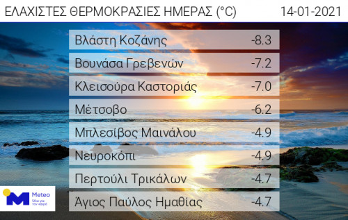 Η θερμοκρασία έπεσε στους -8,3 βαθμούς Κελσίου στη Βλάστη Κοζάνης, ενώ σε μετεωρολογικούς σταθμούς του Εθνικού Αστεροσκοπείου Αθηνών/ Μeteo σε χιονοδρομικά κέντρα και ορεινά καταφύγια, καταγράφηκαν ακόμη χαμηλότερες θερμοκρασίες, όπως πχ στο Λαϊλιά Σερρών (-10.4 βαθμοί).