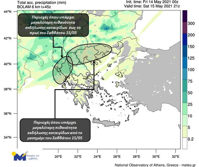 Το κυριότερο χαρακτηριστικό της μεταβολής αυτής θα είναι οι τοπικές βροχές και οι σποραδικές καταιγίδες που αναμένονται το Σάββατο 15/05. Τα φαινόμενα θα εντοπίζονται κατά κύριο λόγο στα δυτικά, κεντρικά και βόρεια ηπειρωτικά και στο Βόρειο Ιόνιο και Αιγαίο. Παράλληλα, θα σημειωθεί πτώση της θερμοκρασίας κατά 3 έως 7 βαθμούς ως προς τις μέγιστες τιμές της, η οποία θα γίνει περισσότερο αισθητή στα κεντρικά και βόρεια ηπειρωτικά. Στην Εικόνα 2 παρουσιάζεται ο ολικός υετός (βροχές/καταιγίδες) που αναμένεται έως το βράδυ του Σαββάτου 15/05 καθώς και οι περιοχές όπου υπάρχει μεγαλύτερη πιθανότητα εκδήλωσης καταιγίδων.