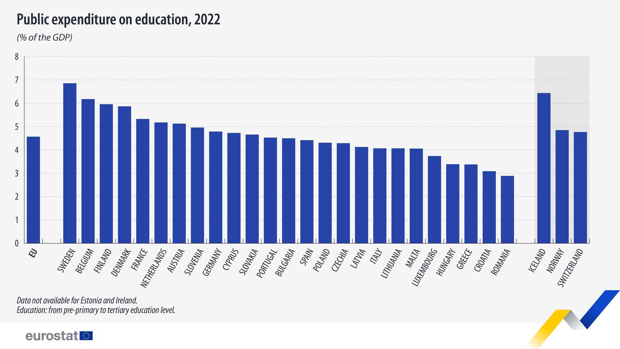 Οι δημόσιες δαπάνες για την εκπαίδευση (από την προσχολική έως την τριτοβάθμια εκπαίδευση) στην ΕΕ αντιπροσώπευαν το 4,6% του Ακαθάριστου Εγχώριου Προϊόντος (ΑΕΠ) το 2022, σύμφωνα με τη Eurostat.