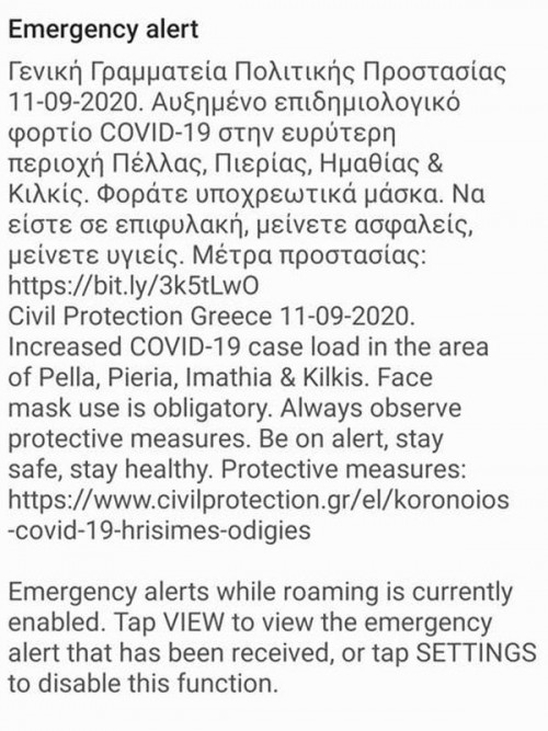 «Αυξημένο επιδημιολογικό φορτίο Covid-19 στην ευρύτερη περιοχή Πέλλας, Πιερίας, Ημαθίας και Κιλκίς. Φοράτε υποχρεωτικά μάσκα. Να είστε σε επιφυλακή, μείνετε ασφαλείας, μείνετε υγιείς», αναφέρει το σχετικό μήνυμα της γενικής γραμματείας Πολιτικής Προστασίας που έφτασε στα κινητά τηλέφωνα των πολιτών και οδηγεί στα αναλυτικά μέτρα που είναι σε ισχύ σε αυτές τις περιοχές.