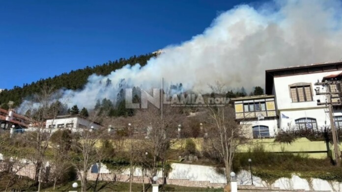 Η φωτιά, που ξέσπασε από άγνωστη μέχρι στιγμής αιτία στις 15.30 περίπου το μεσημέρι, μαίνεται σε δύσβατη έκταση κοντά σε γνωστό ξενοδοχείο.