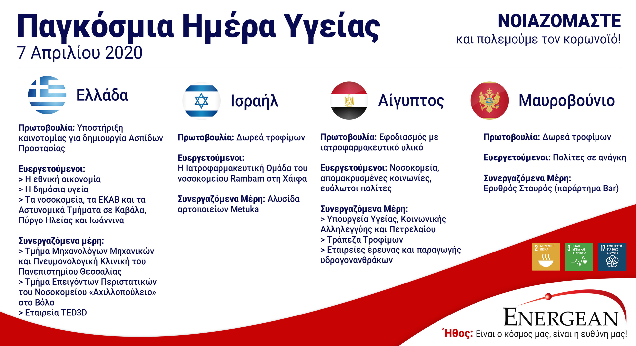 Η Παγκόσμια Ημέρα για την Υγεία τιμάται σήμερα 7 Απριλίου σε όλο τον κόσμο και η Energean αναλαμβάνει μία σειρά από πρωτοβουλίες σε τέσσερις χώρες στις οποίες ήδη δραστηριοποιείται, στο πλαίσιο της προσπάθειας καταπολέμησης της πανδημίας του κορωνοϊού.