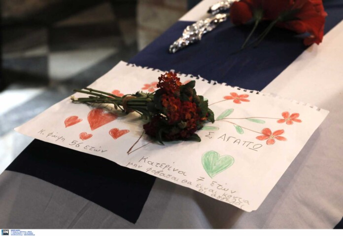 Ιδιαίτερα όμως συγκινητική ήταν μια ζωγραφιά ενός μικρούς κοριτσιού, της 7χρονης Κατερίνας, την οποία και άφησε πάνω από το φέρετρό της Φώφης Γεννηματά. «Σ’ αγαπώ. Μη φοβάσαι, θα είναι κοντά οι άγγελοι», γράφει η 7χρονη Κατερίνα, η οποία επίσης έχει ζωγραφίσει λουλούδια και καρδιές για να αποχαιρετήσει την πρόεδρο του ΚΙΝΑΛ.