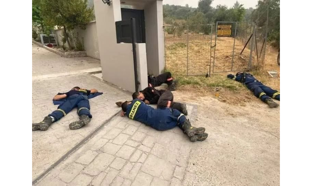 Πρόκειται για μια φωτογραφία που απεικονίζει εθελοντές πυροσβέστες, μέλη του Συλλόγου Εθελοντών Αφιδνών Δασοπροστασίας που έχουν ξαπλώσει στο έδαφος εξαντλημένα, προσπαθώντας να ξεκλέψουν λίγες στιγμές ξεκούρασης.