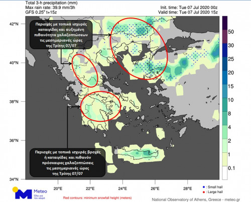 Το Meteo, του Εθνικού Αστεροσκοπείου Αθηνών, έδωσε στη δημοσιότητα προγνωστικό χάρτη στον οποίο αποτυπώνονται οι εκτιμώμενες βροχοπτώσεις κατά το διάστημα 14:00 – 17:00 καθώς και οι περιοχές όπου εκτιμάται ότι θα εκδηλωθούν χαλαζοπτώσεις.