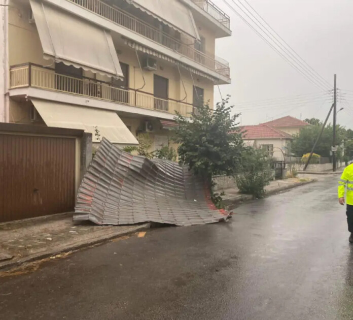 Προβλήματα εντοπίστηκαν και στην περιοχή της Μπάρας, όπου ξηλώθηκε τσίγκινη στέγη και έπεσε μέσα στο δρόμο.