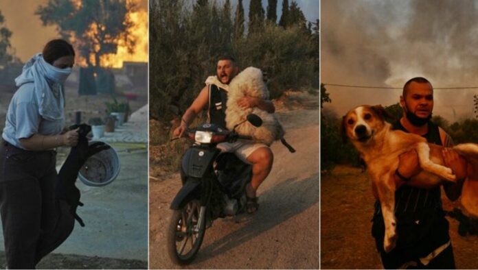 Οι εικόνες συγκλονίζουν: ένας άνδρας πάνω σε μηχανάκι, κρατάει σφιχτά ένα πρόβατο και το μεταφέρει μακριά από τις φλόγες για να το σώσει, μια γυναίκα απομακρύνει τη γάτα της ενώ λίγα χιλιόμετρα πιο πέρα, διακρίνεται η φωτιά να περικυκλώνει τα σπίτια.