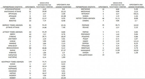 Αναλυτικά οι περιφερειακές ενότητες στις οποίες εντοπίστηκαν τα 384 κρούσματα της Αττικής: Ανατολική Αττική 51, Βόρειος Τομέας Αθηνών 61, Δυτική Αττική 12, Δυτικός Τομέας Αθηνών 44, Κεντρικός Τομέας Αθηνών 124, Νήσων 1, Νότιος Τομέας Αθηνών 46, Πειραιάς 25.