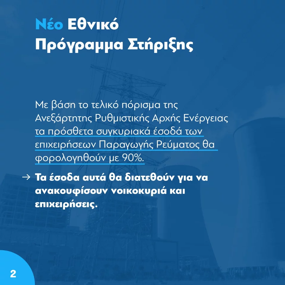 Ταυτόχρονα, για τον Μάιο και τον Ιούνιο θα καλύπτεται κατά 50% η όποια αύξηση στην κατανάλωση και πέραν των 300 KWh. Ενώ, επιπλέον, η νέα έκπτωση θα αφορά και τις μη κύριες κατοικίες, και μάλιστα για το σύνολο της μηνιαίας κατανάλωσης. - Δεύτερον: Οι επιχειρήσεις παραγωγής ρεύματος θα κληθούν να καταβάλουν το δικό τους μέρισμα αλληλεγγύης στην κοινωνία, που δοκιμάζεται από την ακρίβεια. Με βάση, λοιπόν, το τελικό πόρισμα της Ανεξάρτητης Ρυθμιστικής Αρχής Ενέργειας, που αναμένεται τις αμέσως επόμενες μέρες, τα πρόσθετα συγκυριακά έσοδά τους θα φορολογηθούν με ένα ειδικό τέλος ύψους 90%.