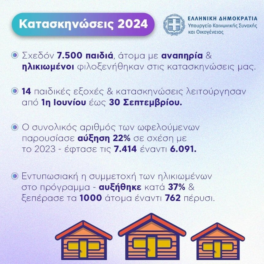 Από την 1η Ιουνίου έως και τις 30 Σεπτεμβρίου λειτούργησαν συνολικά σε ολόκληρη τη χώρα, 14 παιδικές εξοχές και κατασκηνώσεις, και φιλοξενήθηκαν σχεδόν 7.500 παιδιά, άτομα με αναπηρία και ηλικιωμένοι «με υποδειγματικό τρόπο φέτος στις κατασκηνώσεις μας», όπως ανακοίνωσε η υπουργός Κοινωνικής Συνοχής και Οικογένειας της Ελλάδας Σοφία Ζαχαράκη.