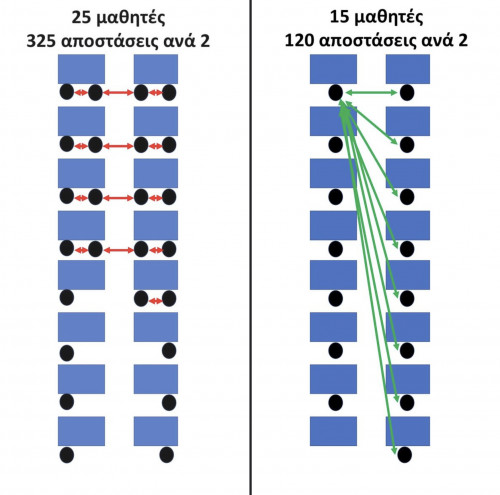 Ο Δρ. Μαγιορκίνης αναγνωρίζει πως ένα θέμα που «συζητείται διαρκώς», είναι πόση είναι η επιβάρυνση των αποστάσεων μεγαλύτερων του 1.5 μέτρου στις τάξεις 25 μαθητών, σε σχέση με τις τάξεις 15 μαθητών. Ο ίδιος ανάρτησε ένα σχεδιάγραμμα με τις διαφορές στις δύο τάξεις.