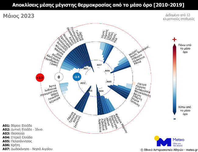 Σύμφωνα με το δίκτυο 53 μετεωρολογικών σταθμών του Εθνικού Αστεροσκοπείου Αθηνών/meteo.gr που λειτουργούν ανελλιπώς από το 2010 μέχρι σήμερα, τον φετινό Μάιο η μέση τιμή των μεγίστων ημερήσιων θερμοκρασιών κυμάνθηκαν χαμηλότερα από τον μέσο όρο της περιόδου 2010-2019.