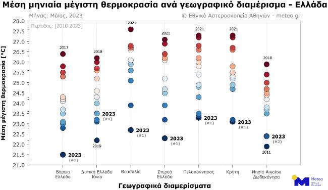 Το επόμενο γράφημα παρουσιάζει την κατάταξη του μήνα Μαΐου ανά έτος, ανάλογα με τη μέση μηνιαία τιμή της μέγιστης θερμοκρασίας. Για τη Βόρεια Ελλάδα, τη Θεσσαλία, τη Στερεά Ελλάδα, την Πελοπόννησο και την Κρήτη ήταν ο πιο ψυχρός Μάιος από το 2010. Για τα υπόλοιπα νησιά του Αιγαίου ήταν ο 2ος πιο ψυχρός μήνας μετά το 2011, και για τη Δυτική Ελλάδα ήταν ο 4ος πιο ψυχρός μήνας τα τελευταία 14 χρόνια.