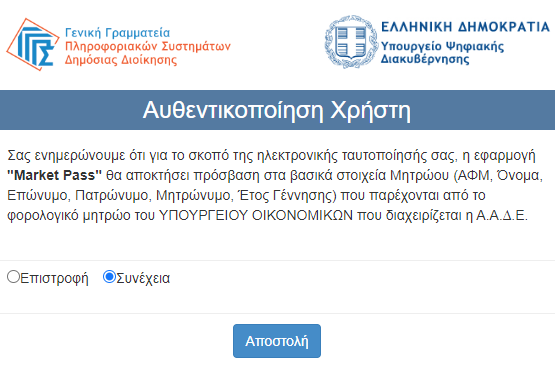 Ο πολίτης εισέρχεται στο Market Pass χρησιμοποιώντας τους κωδικούς Taxisnet είτε απευθείας μέσω του vouchers.gov.gr, είτε από το gov.gr, στην ενότητα «Περιουσία και φορολογία» και την υποενότητα «Επιδοτήσεις πολιτών».