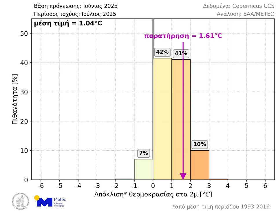 Όσον αφορά τον περασμένο Ιούλιο, η μέση θερμοκρασιακή απόκλιση στην ΝΑ Ευρώπη ήταν +1.61°C, ενώ η μέση τιμή όλων των σεναρίων της μακροπρόθεσμης πρόγνωσης που εκδόθηκε τον Ιούνιο του 2025 ήταν +1.04°C. Όπως φαίνεται στο παρακάτω γράφημα (Εικόνα 3), το μέγεθος της απόκλισης που παρατηρήθηκε είχε πιθανότητα 41% και ήταν το 2ο πιθανότερο πεδίο τιμών στην μακροπρόθεσμη πρόγνωση.