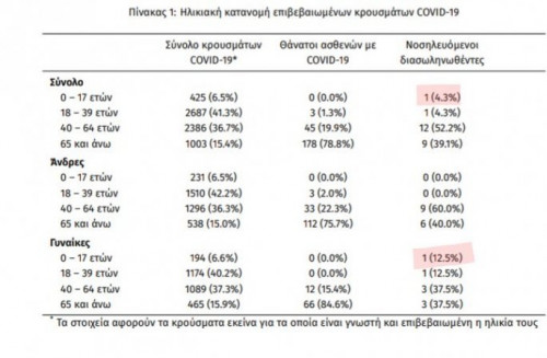 Στο ίδιο διάστημα τρεις ακόμα ασθενείς με Covid-19 έχασαν την ζωή τους και ο συνολικός απολογισμός των νεκρών στην Ελλάδα ανέρχεται σε 226. Από αυτούς, οι 78 (34.5%) ήταν γυναίκες και οι υπόλοιποι άνδρες. Η διάμεση ηλικία των θανόντων ήταν τα 77 έτη και το 95.6% είχε κάποιο υποκείμενο νόσημα ή/και ηλικία 70 ετών και άνω.