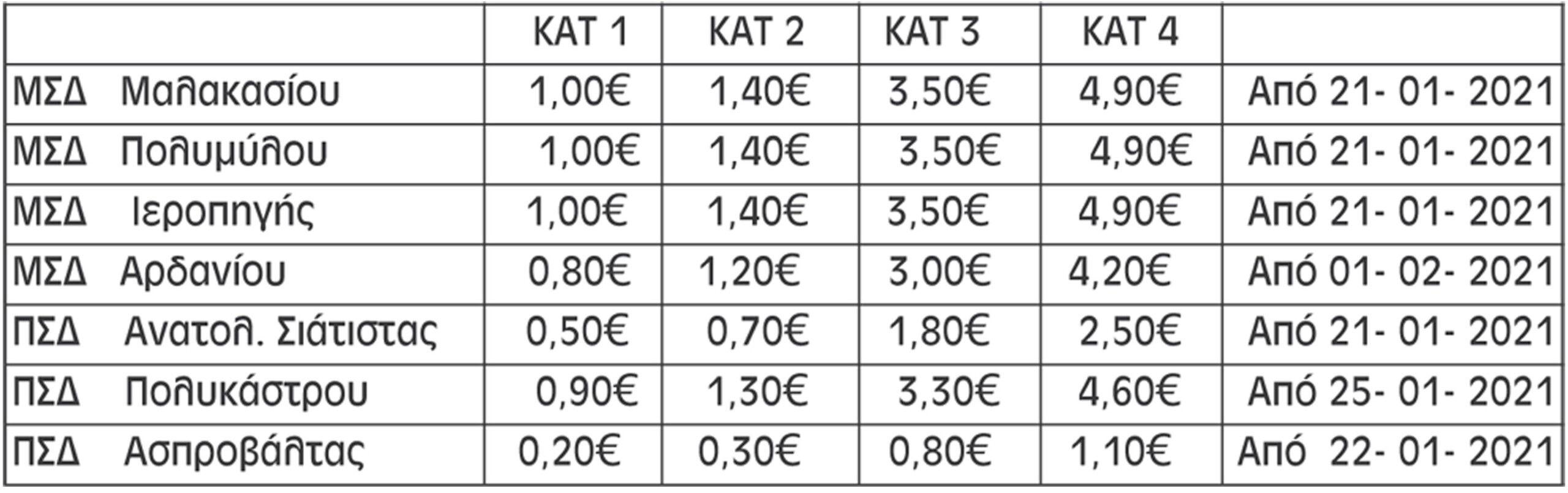 Το τέλος διοδίων των νέων σταθμών ως επίσης και των σταθμών διοδίων που το τέλος διοδίων αναπροσαρμόζεται, ανά Κατηγορία οχήματος όπως στον πίνακα.