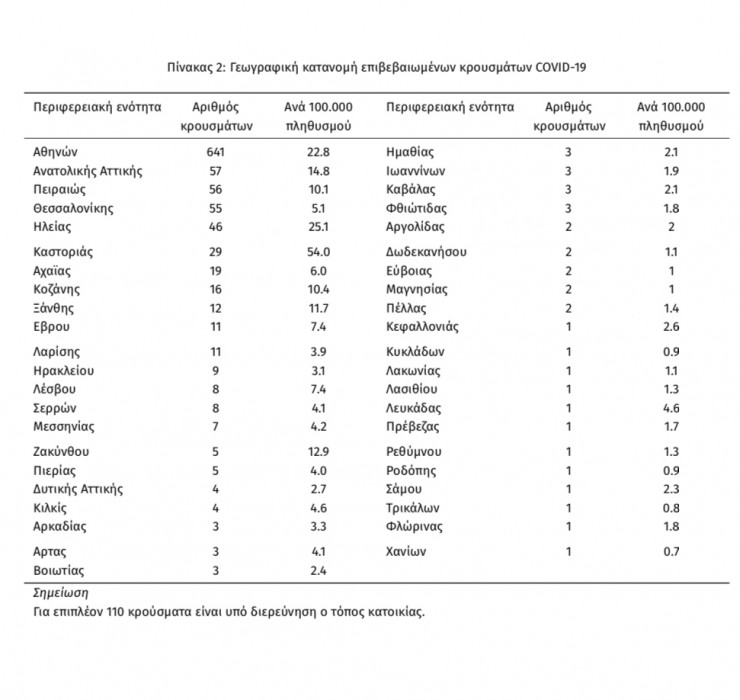 Κατανομή των κρουσμάτων Ο μεγαλύτερος αριθμός κρουσμάτων εντοπίζεται στην Αττική και ακολουθούν κάποιες περιοχές της χώρας όπως η Θεσσαλονίκη, η Καστοριά, η Ηλεία, η Κοζάνη, η Αχαΐα και η Ξάνθη, όπου υπήρξαν εστίες νέων μολύνσεων και μεγαλύτερη έκθεση του πληθυσμού στον ιό.