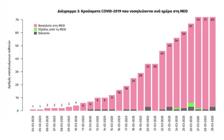 Μέχρι στιγμής, 38 ασθενείς με COVID-19 έχουν καταλήξει στην Ελλάδα, ενώ 69 ασθενείς νοσηλεύονται σε Μονάδα Εντατικής Θεραπείας (ΜΕΘ). Στο παρακάτω διάγραμμα απεικονίζεται ο αριθμός των κλινών ΜΕΘ που νοσήλευαν ασθενείς με COVID-19 κατά τις τελευταίες ημέρες και με γκρίζο χρώμα αποτυπώνεται ο αριθμός των ασθενών που κατέληξαν την αντίστοιχη ημερομηνία. Οι αριθμοί αφορούν τους ασθενείς που συνεχίζουν να νοσηλεύονται.